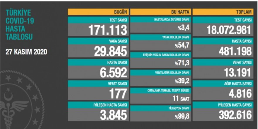 Sağlık Bakanı Fahrettin Koca twitterdan yaptığı paylaşımda; ''Bugün tespit edilen 6.592 yeni hastamız var. Ağır hasta sayımız 5.000’e yaklaştı. Kayıplarımız artıyor. Tedbirlere sıkı uyarsak kısıtlama olmadan da mücadele edebiliriz. Yoksa kısıtlamalar kaçınılmaz olur. En güvenli yer evimizdir'' ifadelerini kullandı.