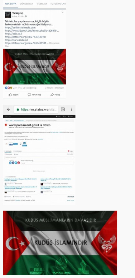 Terör devleti İsrail'in Kudusü başkent ilan etmesine ve Müslümanlara uyguladığı şiddete kayıtsız kalmayan 'Turkz Hacker' Grubu, aralarında parlemento ve dış işlerin de olduğu bir çok İsrail sitesini tüm gün boyunca erişime kapattı ayrıca birçok siteyide hackleyerek kullanılmaz hale getirdi.