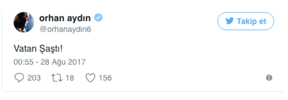 Usta oyuncu Orhan Aydın, Vatan Şaşmaz tweeti sonrası büyük tepki çekti. Oyuncunun hayranları ilgili tweetin altında ünlü oyuncuya çok sert tepki gösterirken, sosyal medyanın kalbinin attığı ekşi sözlük’te de oyuncuya büyük tepki gösterildi.